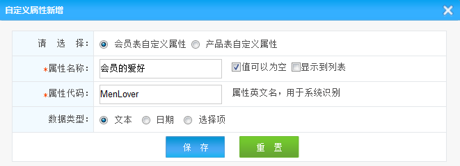1.屬性類型:選擇自定義屬性類型 是會員屬性還是產品屬性