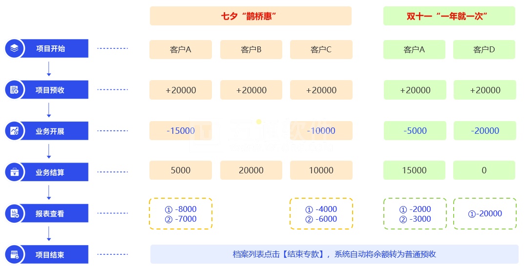 由此,可以清楚的區(qū)分:客戶A總的往來余額為2w;用于“鵲橋惠”的余額僅5000;剩余的1.5w可用于雙十一